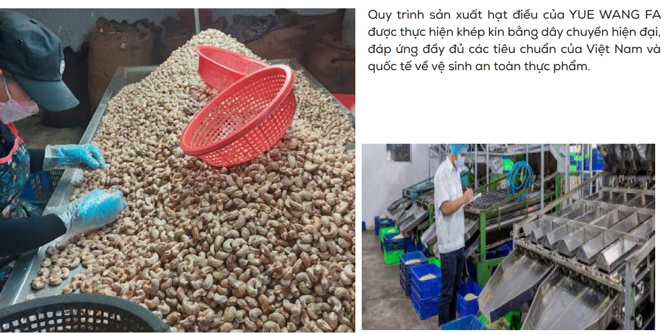 Quy trình sản xuất hạt điều của YUE WANG FA được thực hiện khép kín bằng dây chuyền hiện đại, đáp ứng đầy đủ các tiêu chuẩn của Việt Nam và quốc tế về vệ sinh an toàn thực phẩm.